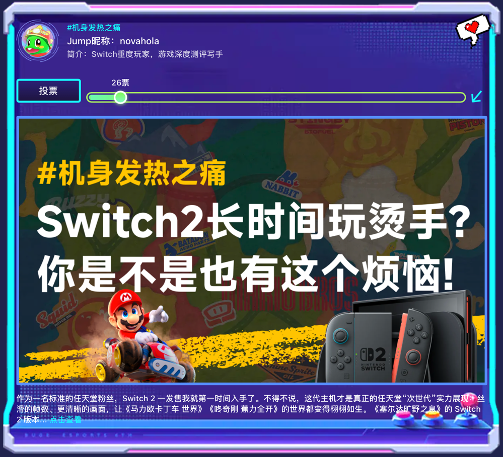 本次社区讨论并非单纯的“吐槽大会”,而是着眼于任天堂Switch2的实际痛点,旨在为玩家提供“简单+好用”的解决方案。活动还为参与者提供了任天堂Switch2游戏主机和三星P9 Express固态存储卡等丰厚奖品。在五位Jump超级版主发起的投票中,涵盖了存档危机、机身发热、频繁插拔卡带、空间焦虑以及加载等待等玩家普遍关心的痛点。