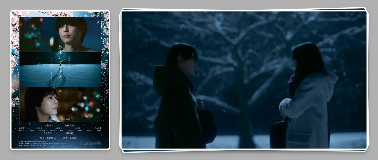 摄影师出身的导演奥山由之将MV创作的细腻手法融入长片,打造了改编自新海诚早期代表作的电影《秒速 5 厘米》。影片在保留原作中远野贵树与篠原明里因分离而产生的情感纠葛的同时,通过松村北斗的动人演绎,为这段青涩的爱情故事注入了新的生命力。重新混音的经典主题曲《One more time, One more chance》的响起,更是唤起了许多观众的青春回忆与情感共鸣。
