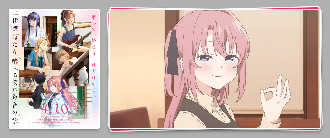 动画《上伊那牡丹,醉姿如百合》以大学宿舍生活为背景,在微醺的情调中描绘了一群少女的日常。故事围绕着对酒产生好奇并逐渐爱上酒的上伊那牡丹与她的舍友们展开。作品在表现人物情感的同时,也融入了对酒的描绘,传递出一种轻松愉悦的氛围。