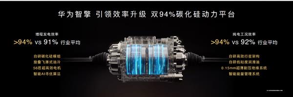华为智擎此次率先定义了行业新标杆,全球首发双94%碳化硅动力平台。这一平台在增程和纯电两种方案中均实现了效率的显著提升。