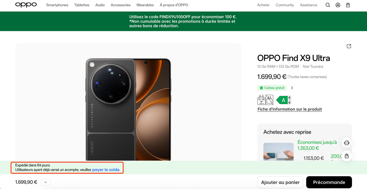 Find X9 Ultra今年已正式登陆包括西班牙、意大利、英国、法国、瑞典及新加坡在内的全球26个国家和地区。例如,在法国市场,512GB版本的Find X9 Ultra已全面售罄,购买者需等待64天才能收到货品,而约合人民币13600元的价格并未削弱当地消费者的购买热情。在西班牙,售价1699欧元的Find X9 Ultra首销表现尤为突出,预订量是去年Find X9系列的三倍,销量更是Find X9 Pro(1299欧元)的1.7倍。
