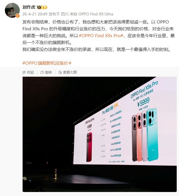 2026年4月21日晚,OPPO在成都举办新品发布会,正式推出影像旗舰Find X9s Pro。在行业集体涨价潮席卷下,这款新机以5299元起售价引发市场热议——其不仅实现影像、屏幕、性能等核心配置的全面升级,更成为2026年首个未随行业涨价的旗舰机型。