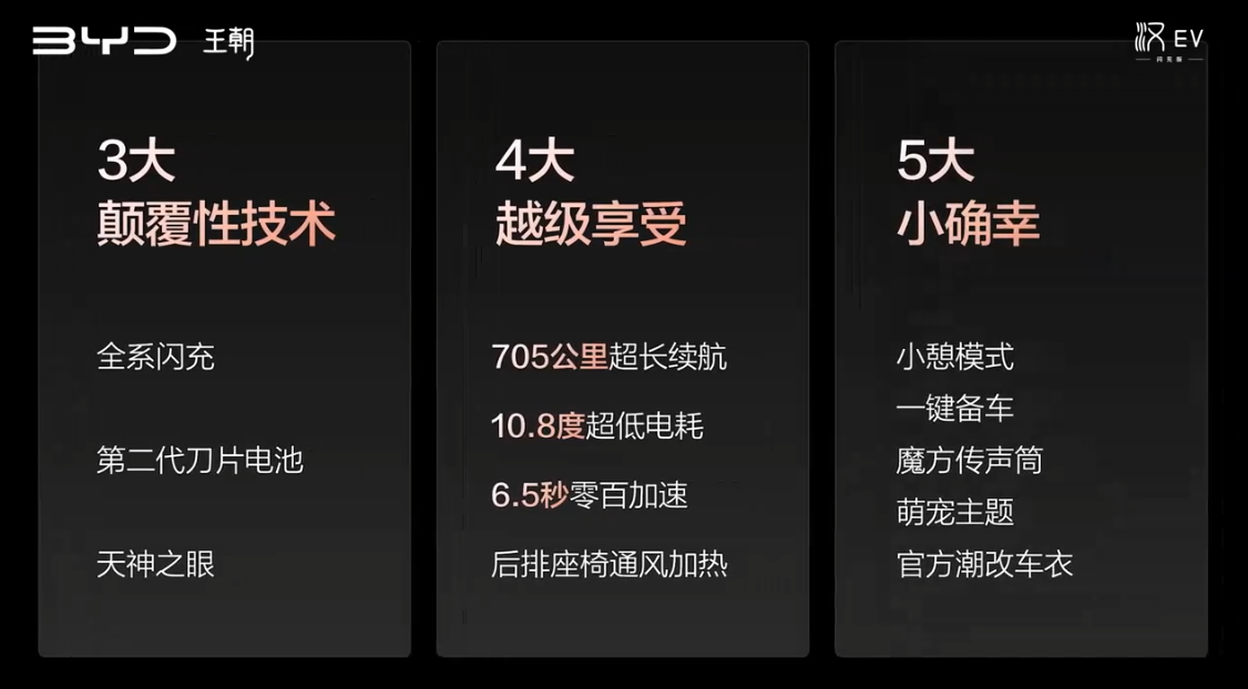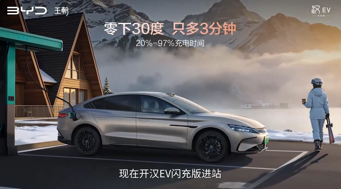 新车型搭载了容量为 69.07 千瓦时的第二代刀片电池,CLTC 工况下续航里程达到 705 公里。其闪充技术尤为突出,宣称实现 5 分钟充电、9 分钟充满,并且在零下 30 摄氏度的低温环境下,续航仅需多充 3 分钟即可满足需求。在电耗方面,汉 EV 闪充版宣称是“全球最低能耗的 C 级轿车”,百公里电耗仅为 10.8 度。