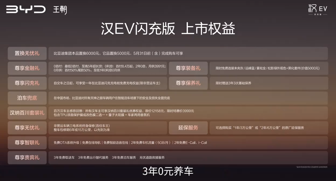 汉 EV 闪充版除了提供 1.2 万元选装的“天神之眼 B 辅助驾驶激光版”,还为消费者提供了包括置换无忧礼、1 年免费闪充权益、优惠金融方案、3 年基础保养以及尊享贵宾礼等在内的多项购车权益。此外,官方还推出了限时特惠的“汉纳百川”进阶生活套装。