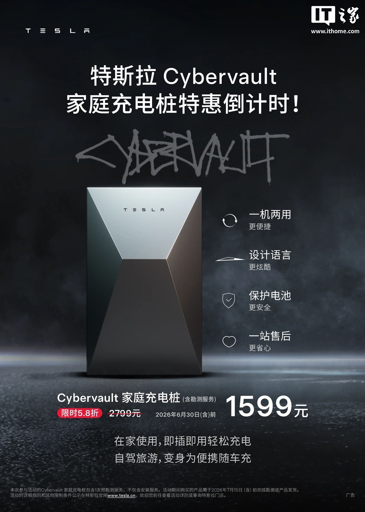 特斯拉 Cybervault 家庭充电桩现正进行限时优惠活动,原价 2799 元,优惠后价格为 1599 元,降幅达 5.8 折。此次活动包含上门勘测服务,并持续至 2026 年 6 月 30 日。